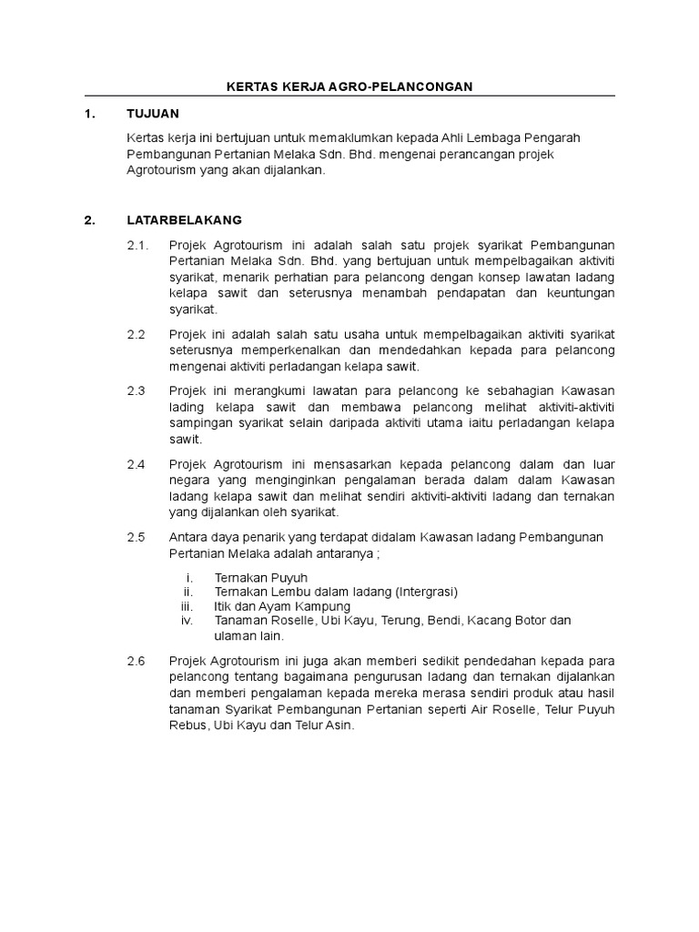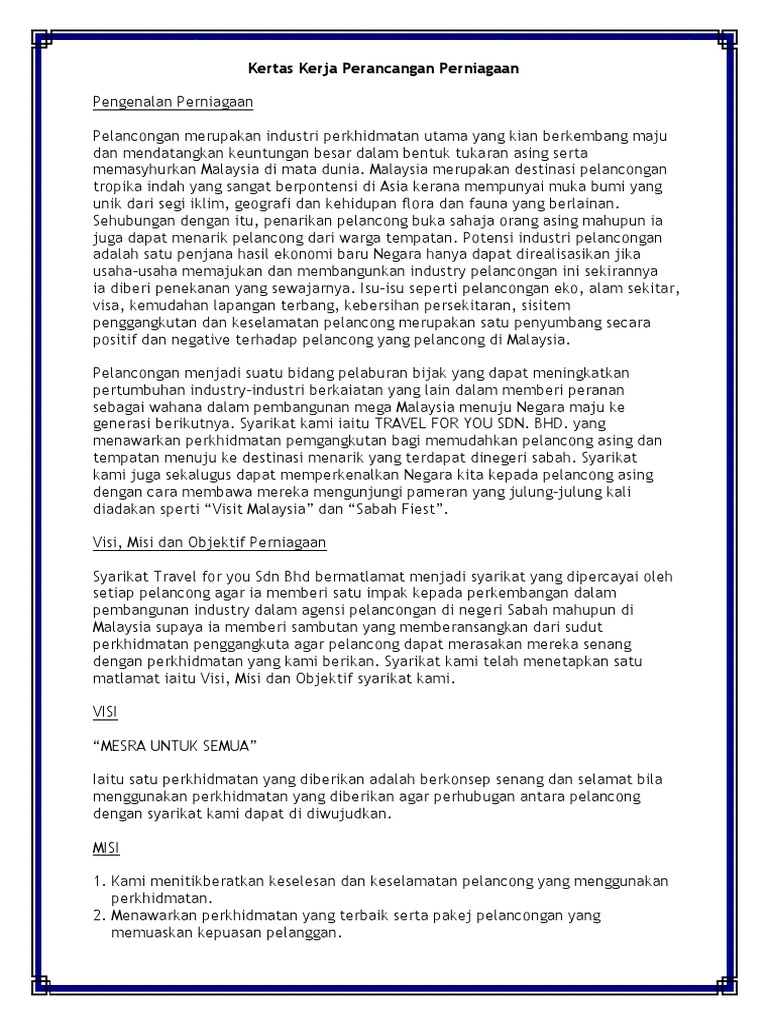 Hubungi Kami Kementerian Pelancongan Seni dan Budaya No. Dengan pelancaran projek ini ianya akan menyediakan kemudahan laluan jungle trekking dan tempat perkelahan yang tenang. 33 contoh Kertas kerja Rancangan Perniagaan boleh edit untuk anda yang ada hasrat berniaga.